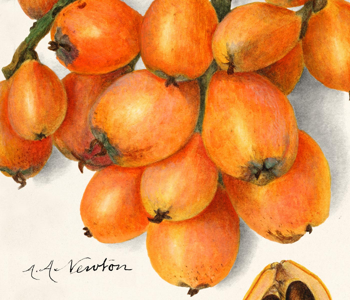 Amanda Almira Newton · 1908 · Luminous loquat botanical print with warm orange fruit and crisp white space