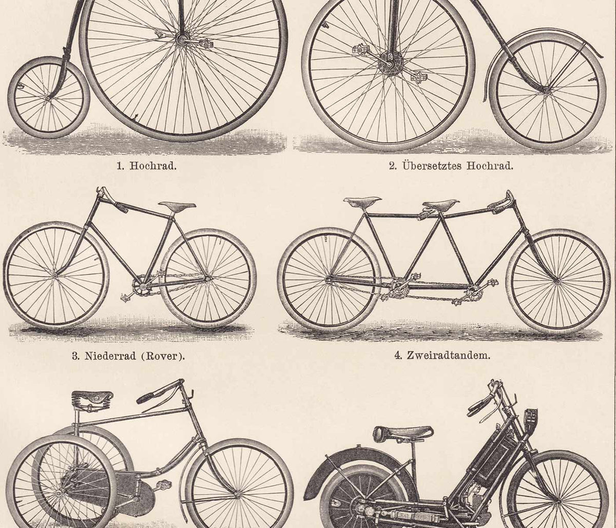 Meyers Konversations Lexikon · 1894 · Lámina vintage detallada de bicicletas con diseños de armazones del siglo XIX en neta línea negra