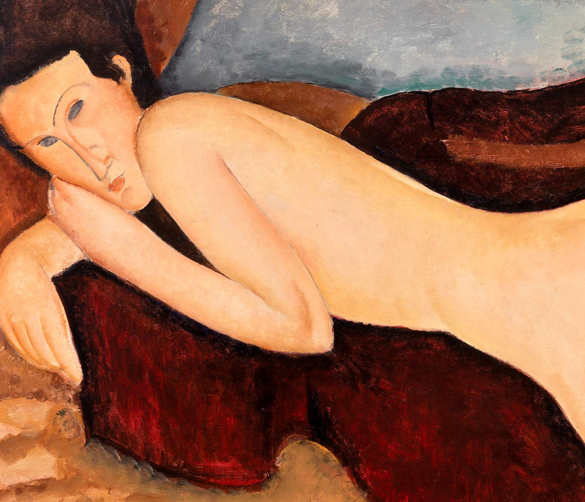 Amedeo Modigliani · 1917 · Sensual reclining nude art print with sculptural contours against rich red and blue tones