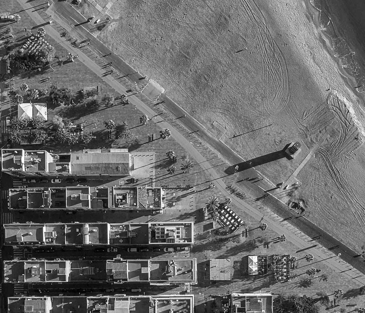 MORYARTY · 2022 · Minimal black-and-white surfer poster capturing calm shoreline energy and open Atlantic horizons