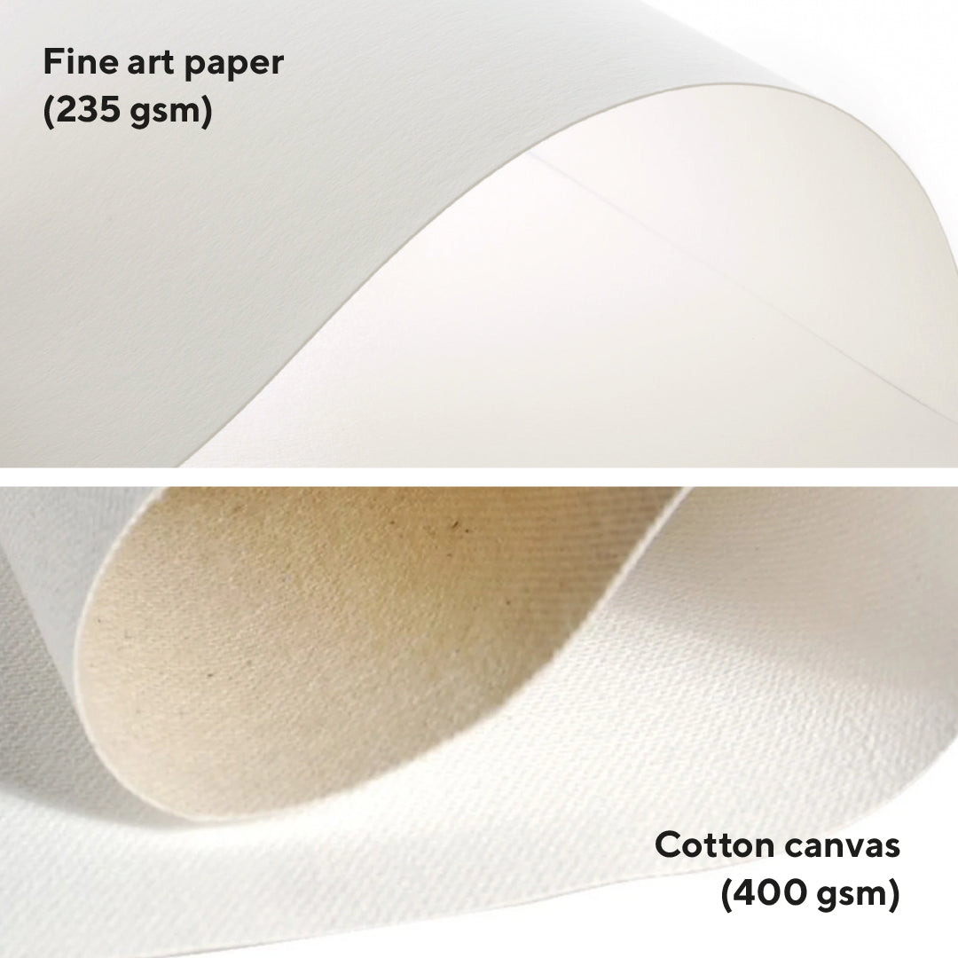 Our posters are printed on thick (230gsm) acid-free matte art paper, using a long-lasting UV-resistant ink. We also offer the option of printing on textured canvas (300gsm), more flexible and resistant. Our frames are made of either light and resistant aluminium, or solid wood. More details in our FAQ
